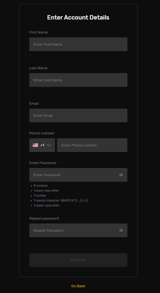 3. Fill in the required fields: First Name, Last Name, Email, Country, Phone Number, Password, and Password Confirmation. Click ‘Continue’ to create your account.
