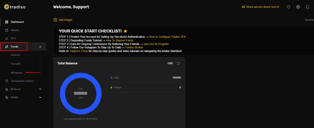 Step 1: Log in to your Tradiso Portal: https://my.tradiso.com/en/auth/sign-in Step 2: On the left-hand side panel, go to Funds > Withdraw.
