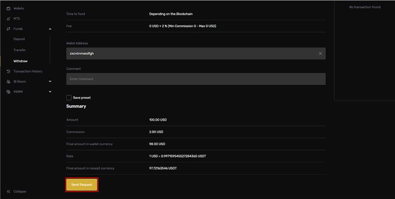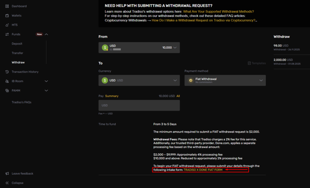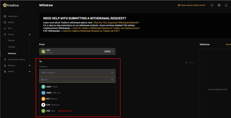 Step 1: Log in to your Tradiso dashboard. From the left-hand menu, select Funds and click on Transfer. Step 2: In the From dropdown menu, select the account you want to transfer funds from (e.g., MT5 Standard, Introducing Broker, MT5 Payment, or MT PAMM Investor Account). Step 3: In the To dropdown menu, select USD under Fiat as the eWallet you want to transfer funds to. Step 4: A new field will pop up to enter the amount you wish to transfer. Step 5: Click Transfer to complete the process. If you need further assistance or have questions about managing funds within your Tradiso account, feel free to check out our next FAQ article: How to Transfer Funds Between Your Accounts on Tradiso. This article will provide helpful insights into transferring funds between accounts for easier transactions, improved account management, or consolidating your balance.Making a Withdrawal Request: