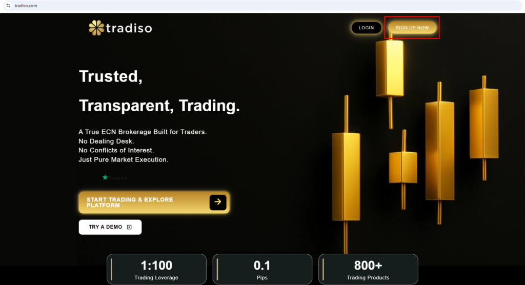 1. Visit the Tradiso website at www.tradiso.com and click the ‘Sign Up Now‘ button to navigate to the sign-up page.