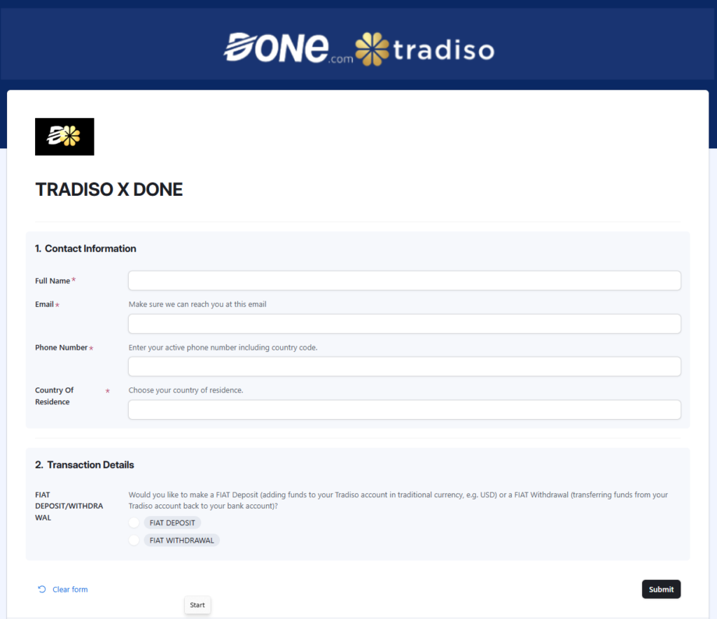 Step 7: To begin your withdrawal request, click the link below and complete Done.com’s FIAT Withdrawal form: TRADISO X DONE FIAT FORM