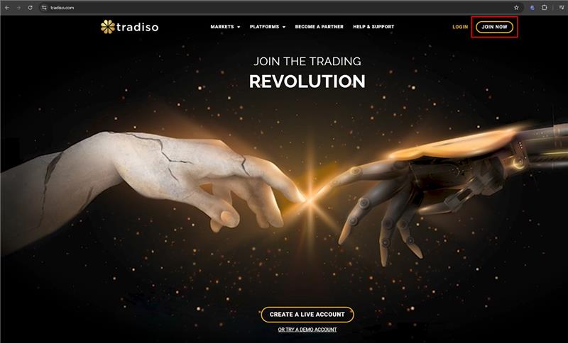 1. Visit the Tradiso website at www.tradiso.com and click the ‘Join Now button to navigate to the sign-up page.